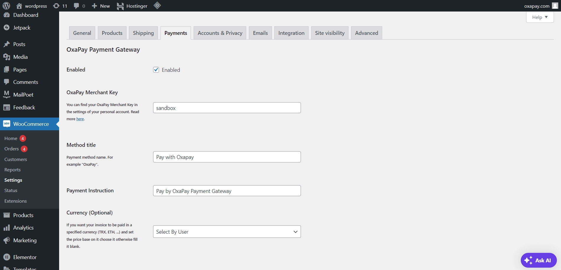 By leveraging WooCommerce, you can efficiently manage various aspects of your online store. Activating the OxaPay plugin on the WooCommerce platform boosts operational efficiency and enhances customer engagement by enabling crypto transactions with minimal fees and fast processing times.