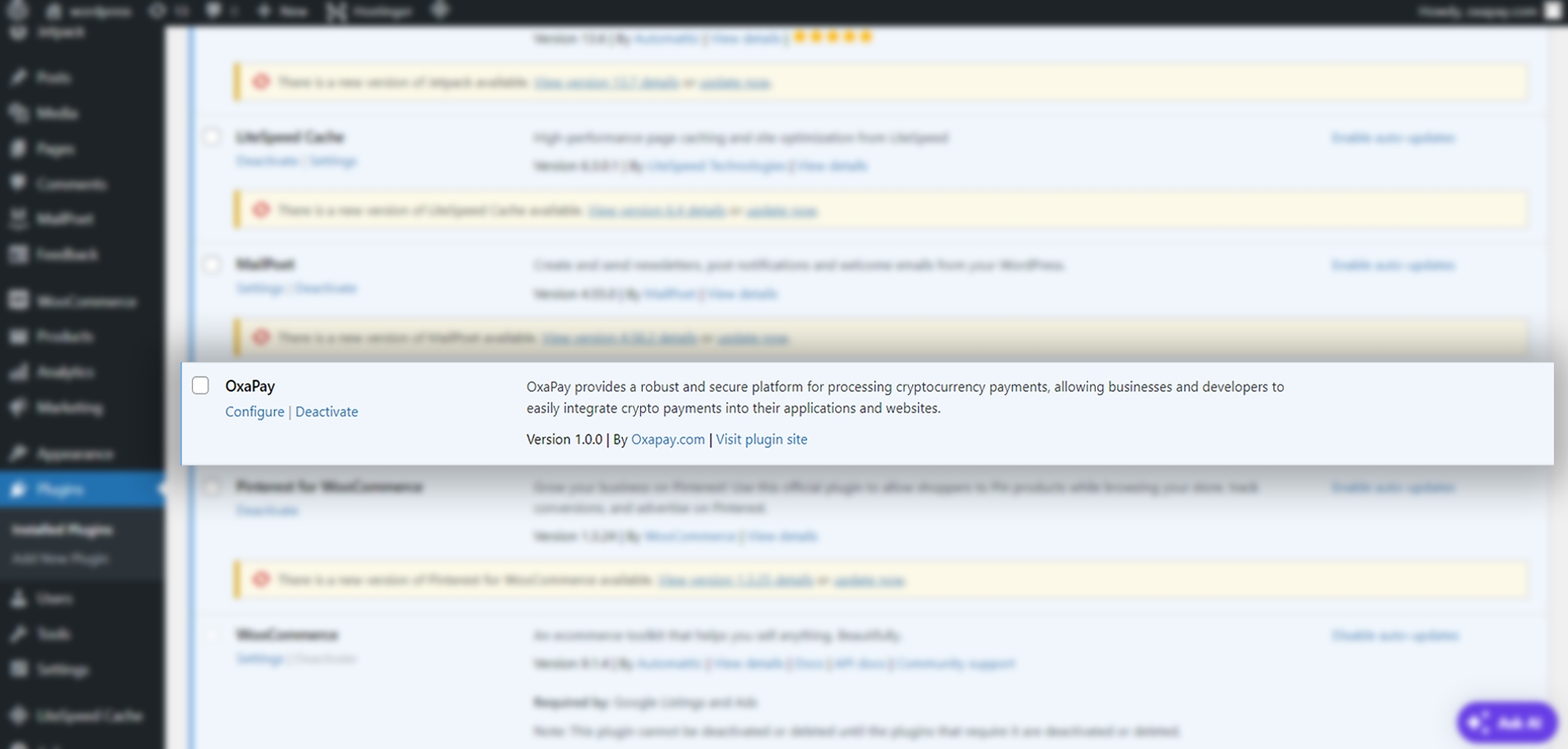 In the list of installed plugins, locate OxaPay and click on the "Configure" link.