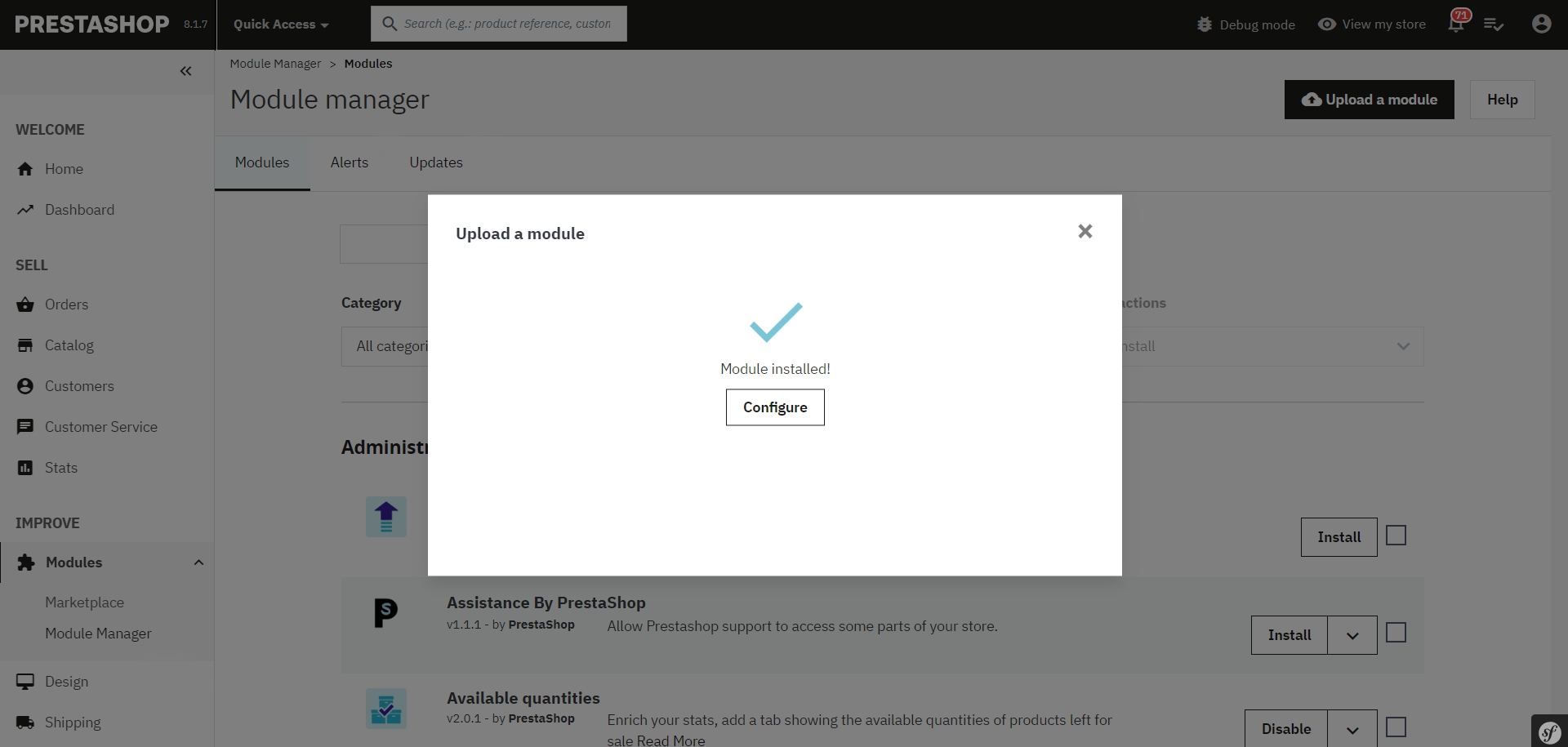 The module installation will begin automatically. Once you see the message "Module installed" and the "Configure" button appears, click it to proceed.