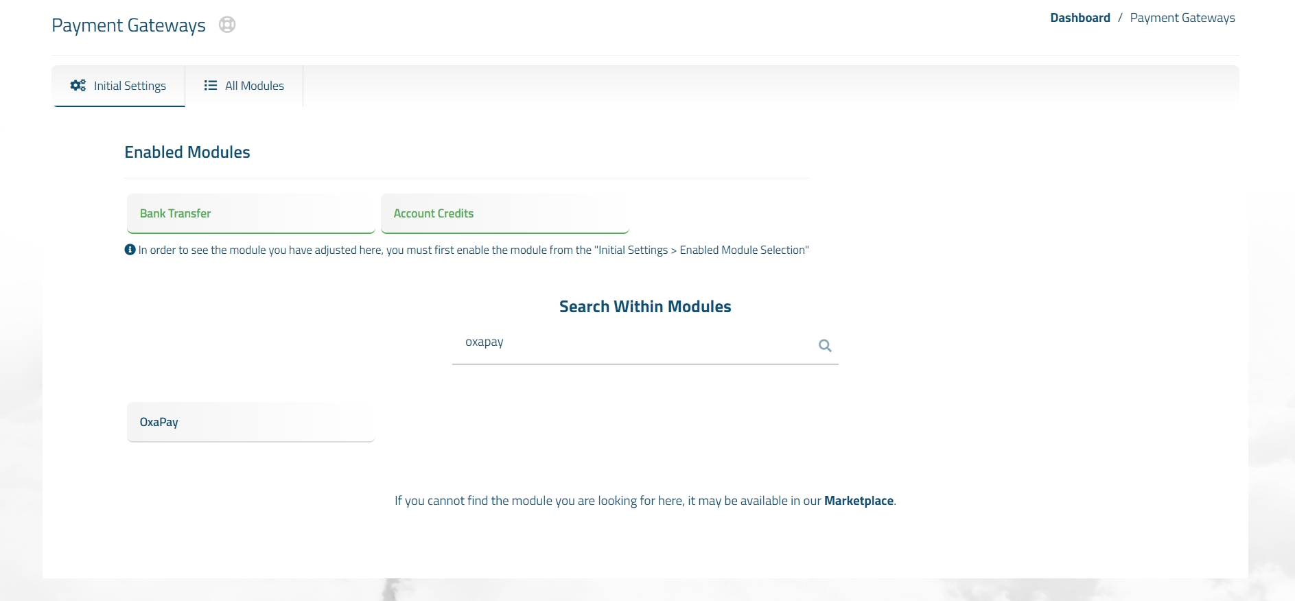 Now, simply search for "OxaPay" in the "Enabled Module Selection" section and click on it.