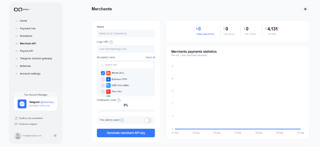 You need an OxaPay account for managing and saving your crypto assets. You can create your OxaPay account free at this link (Need an email and sign up in less than 1 minute):