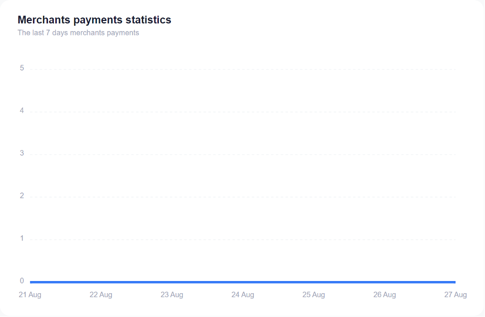 In the "Merchants payments statistics " section, you can view a chart displaying the payment transactions associated with your Merchant payment. This chart provides visual information about the Merchant key activity, allowing you to track and monitor the performance of your Merchant payments over time.