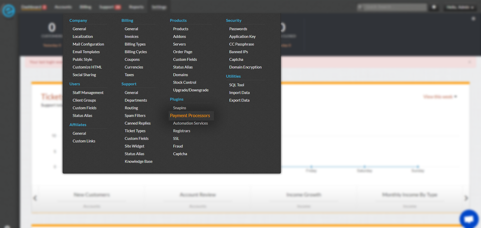 2. The next step is to navigate to the web interface on Clientexec. Hover over the "Settings" tab in the top menu. Then, under the "Plugins" section, click on "Payment Processors."