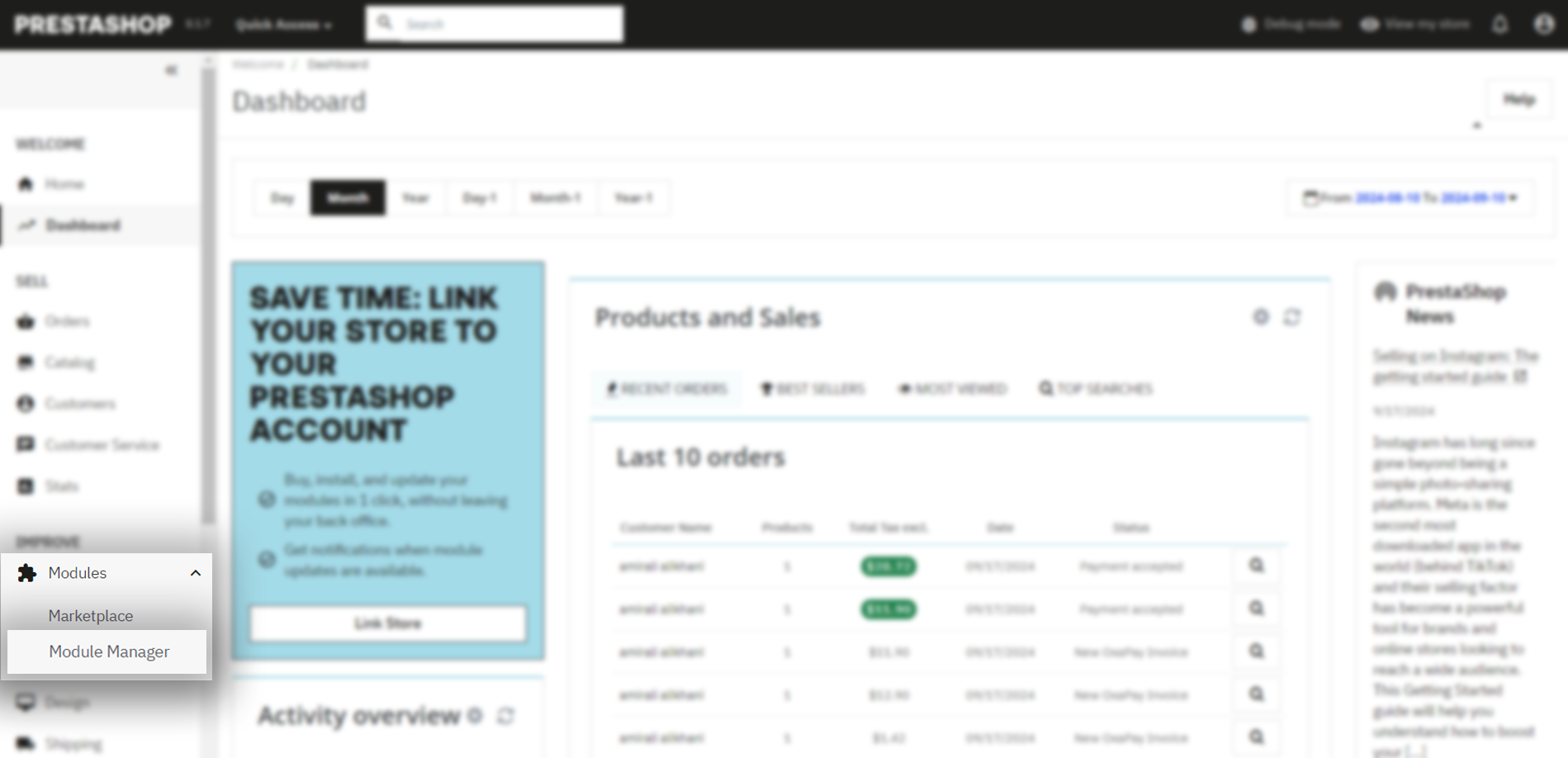 1. First, after logging into your PrestaShop admin panel, locate the "Modules" tab. Click on it, then select "Module Manager" from the dropdown menu.