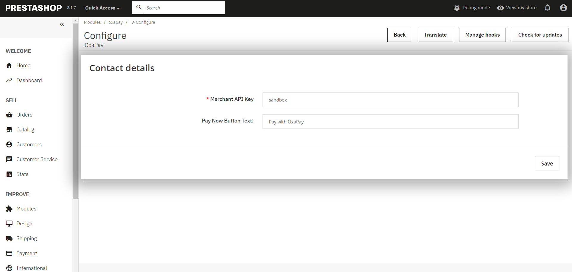 4. Enter your OxaPay Merchant API key (You can find this key in your OxaPay dashboard. If you don't have an API key, [click here](https://docs.oxapay.com/welcome-to-oxapay/integrations/merchant-service) for instructions on how to create one). Complete any other field. You can use the "sandbox" mode for testing. Once all the details are filled in, click "Save" to finalize the setup.
