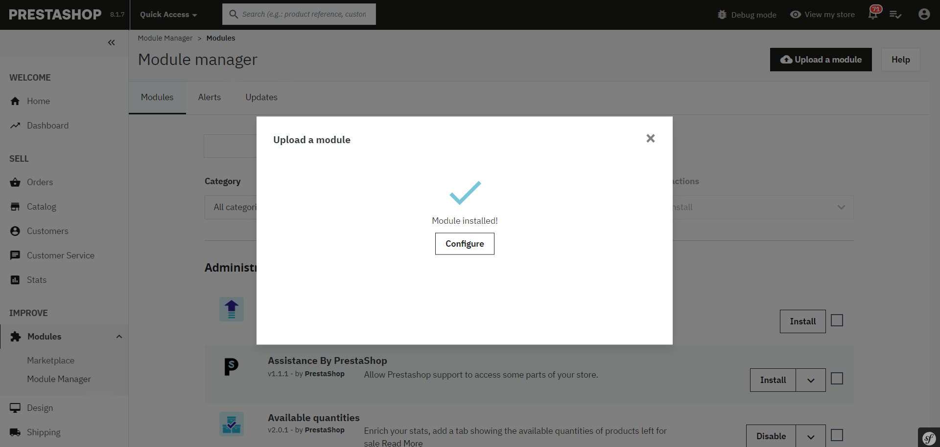 3. The module installation will begin automatically. Once you see the message "Module installed" and the "Configure" button appears, click it to proceed.
