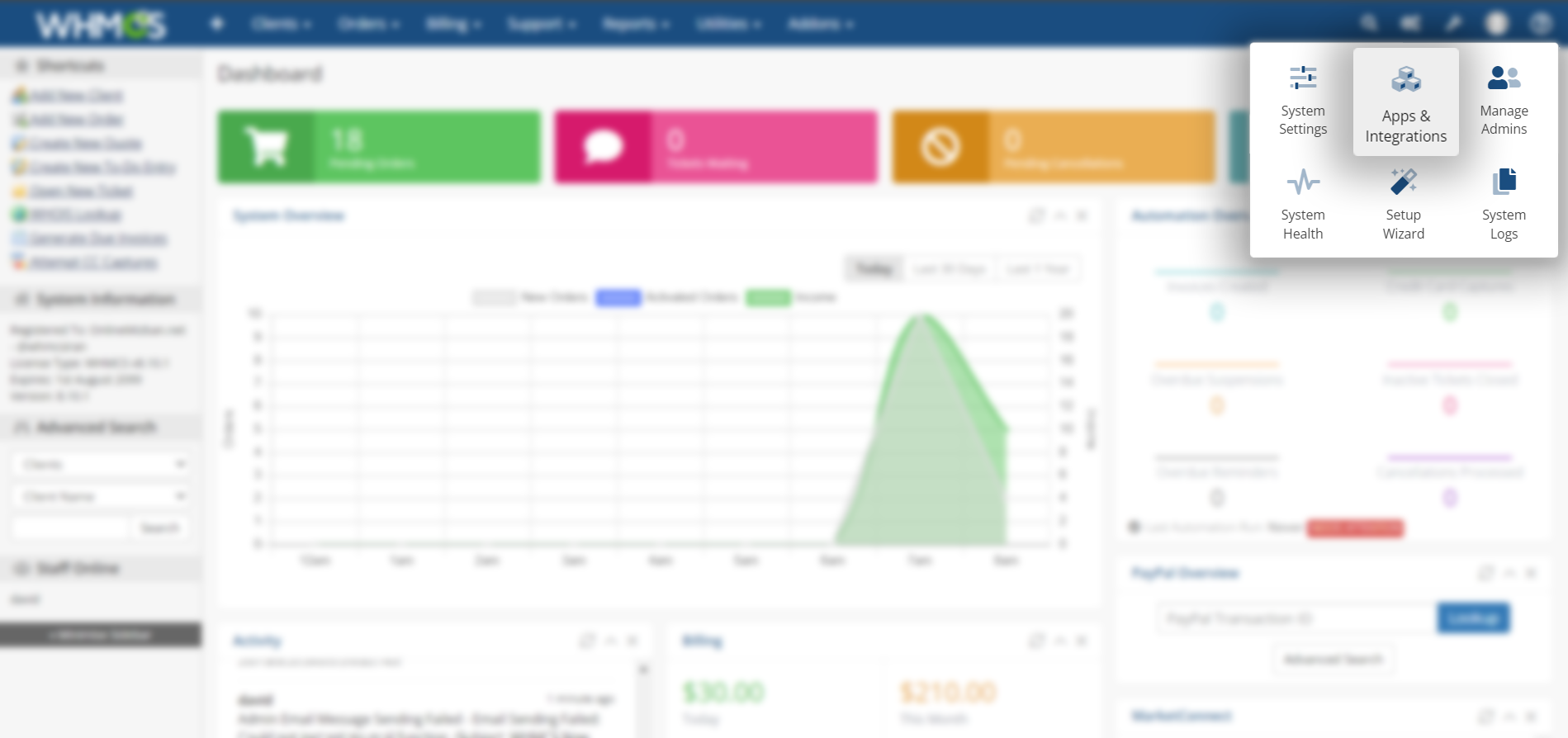 2. **Billing Automation**: WHMCS automates invoicing, payment processing, and reminders. It supports multiple currencies and integrates with numerous payment gateways like PayPal, Stripe, and others, making it easier for web hosting companies to manage their billing.