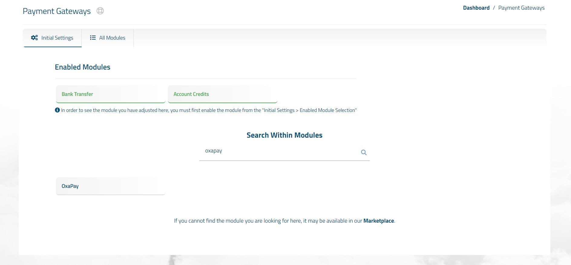 3. Now, simply search for "OxaPay" in the "Enabled Module Selection" section and click on it.&#x20;