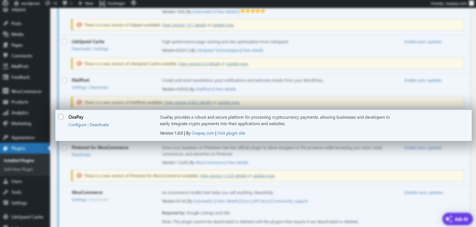 3. In the list of installed plugins, locate OxaPay and click on the "Configure" link.
