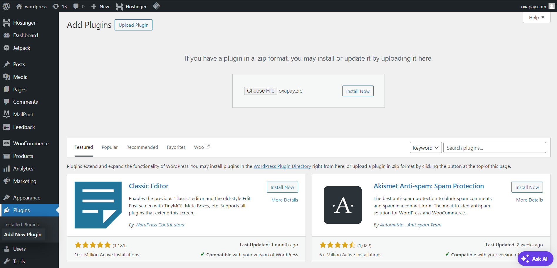1. Log in to your WordPress control panel, navigate to the "Plugins" section, and click on "Add New". Select "Upload Plugin" then upload the "OxaPay" plugin ZIP file ([Click here to download it](https://downloads.wordpress.org/plugin/oxapay.1.0.0.zip)) and click on the"Install Now" button.